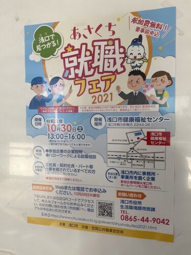 久々に鴨方駅に行くと、こんなポスターを発見♪ 10/30(土)13時~16時、浅口市健康福祉センターで、浅口市内の会社が集うあさくち就職フェアが開催されるようよー☆ 近くで働きたいという方は、ぜひ♪ 事前申し込み制よ! 詳細はこちら→浅口市/あさくち就職フ…