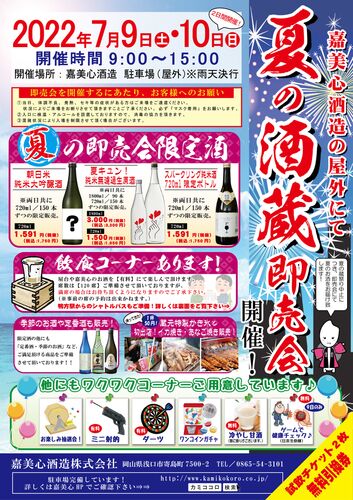 7/9(土)10(日)は寄島の嘉美心酒造さんが夏の酒蔵即売会を開催されるそうよ~! もうすっかり暑くなってきたものね~! 待ち遠しいわ♪ 好評の「夏キュン!純米無濾過生原酒」などの限定酒も登場よー! 有料飲食コーナーも見逃せないわね♪ 無料の冷やし甘…